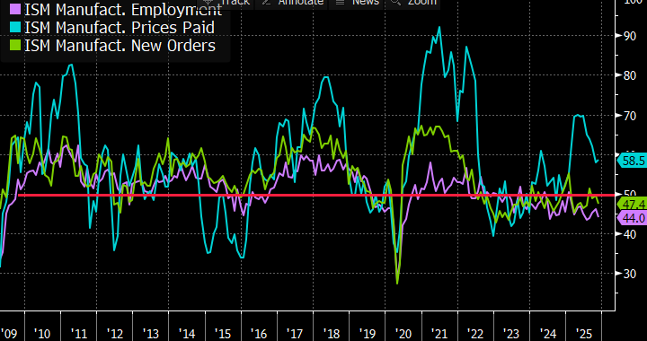 - At 10am ET, the November ISM Services Report will be released with expectations for the index to be relatively unchanged at 52.0 vs. 52.4 in October. Just like with Monday’s manufacturing numbers, the Prices Paid, New Orders, and Employment indices will get plenty of attention given the delayed BLS reports. The ISM Manufacturing release disappointed across-the board (see graph below), but something similar in the services survey, which is a much larger slice of the economy, will set off alarm bells at the Fed, so stay tuned for those results.