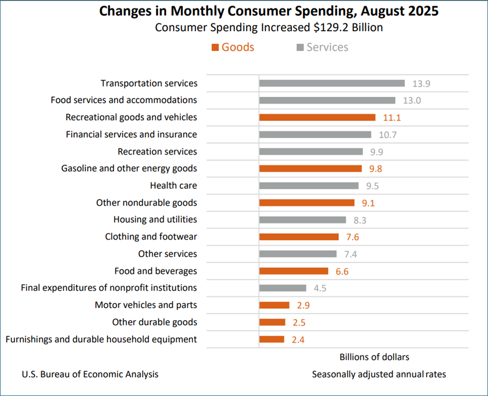 - However, in a reversal from July, August spending gains were highest in discretionary items vs. essential items like housing and healthcare. This is a break from a three-month trend that had the consumer showing more caution about what they were buying (essentials vs. discretionary), but that pent-up demand for more “fun” spending gave way in August, (see table below of spending categories).
