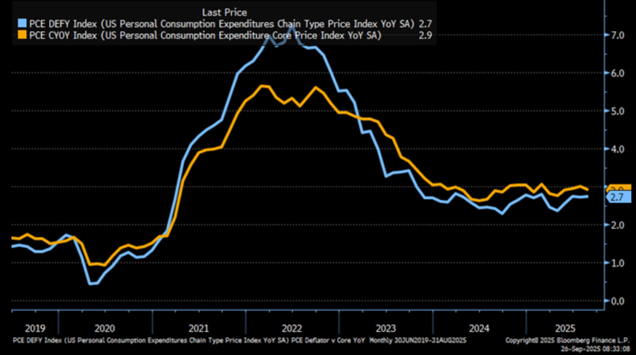 - The big report for the week is out with August Personal Income and Spending with the Fed’s preferred inflation gauge PCE. Core PCE rose 0.2% (0.23% unrounded) which matched estimates but eased from July’s 0.3% (0.28% unrounded). YoY core remained at 2.9% for a second straight month, matching expectations, but also the highest since February’s 2.949%. In addition, goods inflation increased 0.9% YoY from 0.6% in July and continues to move up from the deflationary trend prior to the tariff policy change. Service side inflation edged higher as well to 3.6% YoY vs. 3.5% in July.