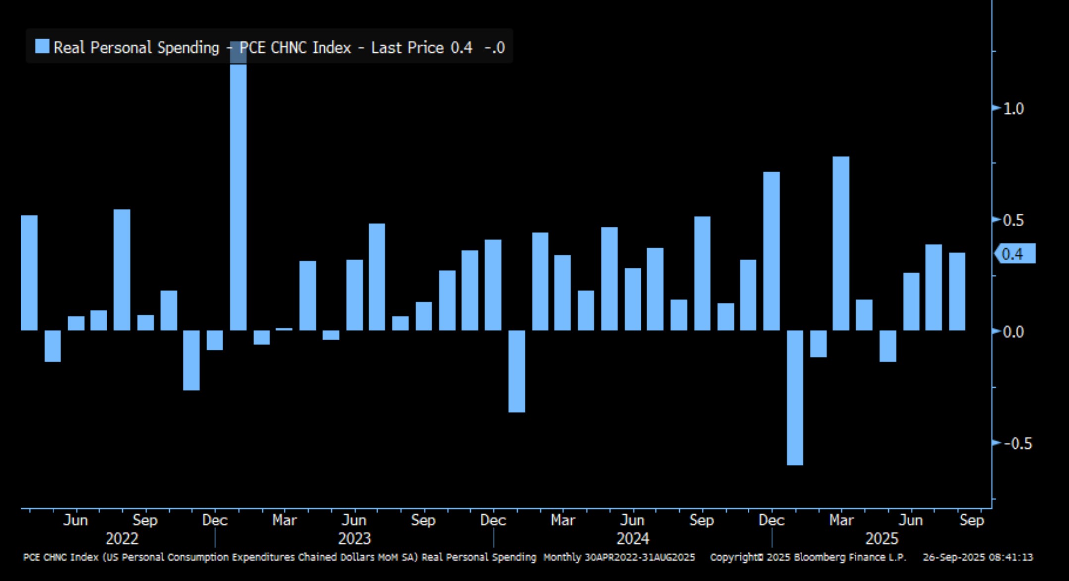 - Personal income increased 0.4% vs. 0.3% expected and 0.4% in July. Personal spending increased 0.6% vs 0.5% expected and 0.5% in July. It’s the highest monthly spending gain since March’s 0.8%. Real spending (net of inflation) remained at 0.4% MoM, beating the 0.2% expectation but matching the prior month’s pace. Along with July, it’s the highest real spending since March’s 0.8%. While personal spending has slowed some from its torrid 2024 pace, it remains solid despite the swirl of economic uncertainty and slowing job growth and has clearly been the lynchpin of this economy.
