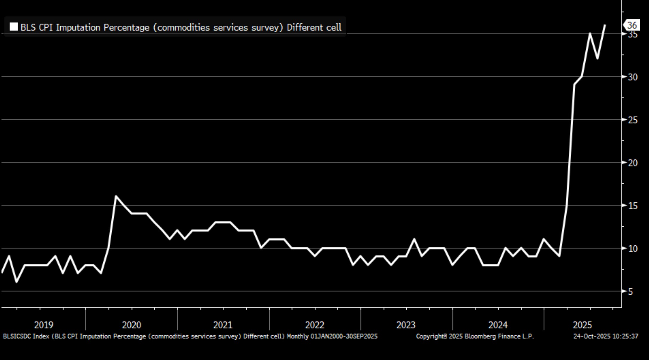 - In that regard, it’s being reported that 40% of CPI line items were based on imputation, meaning data collectors had to fill in missing data by using values from related but different categories or geographic areas (see graph below on “cell imputation). Thus, it could be that this report is treated with something of a jaundiced eye. The good news, perhaps, is that OER is definitely rolling over and with ongoing weakness in rental prices due to easing demand and increased supply, it should continue to be a favorable input into inflation calculations in 2026. We should add the caveat, however, that OER as explained above is one of the more labor-intensive pieces as it uses rental and value surveys extensively, so it seems likely “cell imputation” was a key piece for the September result.