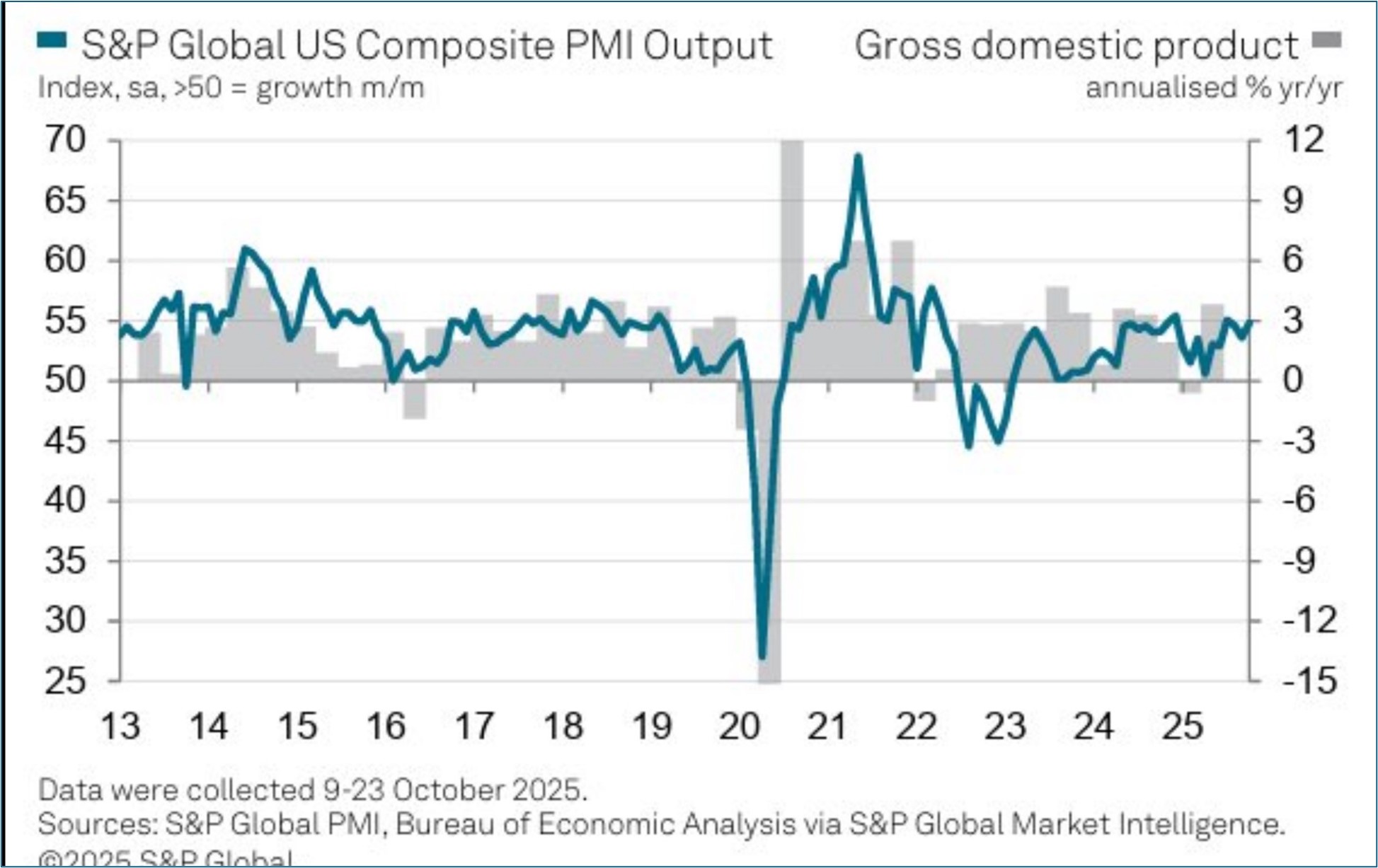 - Chris Williamson, Chief Business Economist at S&P Global Market Intelligence: “October’s flash PMI data point to sustained strong economic growth at the start of the fourth quarter, with business activity picking up momentum across both manufacturing and services despite some reports of businesses being adversely impacted by the government shutdown. The survey data are consistent with the economy expanding at a 2.5% annualized rate in October after a similar rise was signaled for the third quarter. “However, business confidence in the outlook for the coming year has deteriorated further and is at one of the lowest levels seen over the past three years as companies worry about the impact of policies, most notably tariffs. Companies are also concerned over disappointing export sales, especially in manufacturing, and factories are seeing an unprecedented rise in unsold stock. Having bought excess inputs earlier in the year to front-run tariffs, producers are making more goods to use up these inputs but are often struggling to sell the end product to customers. “Hence, although input costs continued to rise sharply again in October, principally reflecting the pass-through of tariffs, average selling price inflation has cooled to the lowest since April as firms compete on price to win sales.”