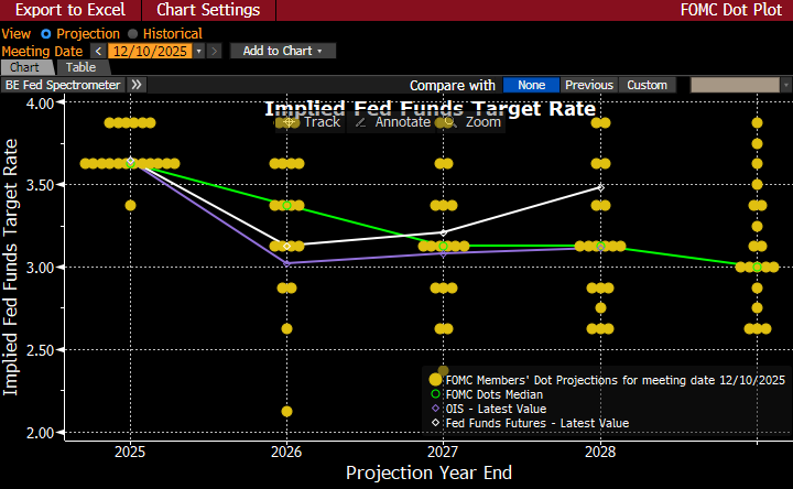 - Of course, the FOMC will have a new Fed Chair in May, and the odds are the new chairman, given Trump’s desires, will be more inclined for rate cuts than Powell; thus, the futures market continues to bet there will be closer to two cuts next year. There were three dissents in total: Miran who wanted a 50bps cut, and Goolsbee and Schmid wanted to pause. However, the updated dot plot shows six members penciling in a higher rate for this year end than the 3.50% -3.75 that was approved today. Those represent either “silent dissents:” from non-voters and/or “soft dissents” from voters who went with the majority today but harbor reservations. That implies a more divided Fed than the vote tally reflects. That will make additional cuts a heavier lift in 2026.