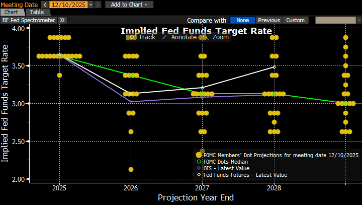 - In addition to the dissents there were a total of six members in the dot plot that felt no rate cut was necessary. While two of the six are known via their declared dissents, four represent either non-voters or voters who agreed with the cut while signaling something different on the dot plot. The disparity doesn’t end there. Look at the following years in the dot plot and the range of rate views grows even greater. Analysts surmised that the building cacophony of voices will make achieving a consensus in 2026 akin to herding cats.