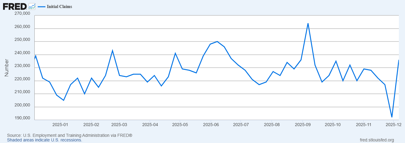 - In regard to assessing the labor market, this week’s jobless claims numbers only added to the confusion. In the week ending December 6, initial jobless claims were 236,000, an increase of 44,000 from the previous week’s unusually low 192,000. The 4-week moving average was 216,750, an increase of 2,000 from the previous week’s 214,750. The unusually low claims print occurred during Thanksgiving week, and seasonal adjustments often have trouble around holiday weeks so one can point to the latest figure as a return to the long-run trend of low 200k prints. So far, so good.