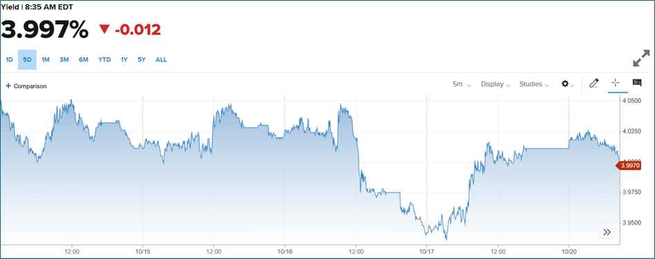 - Treasuries are waffling around unchanged levels this morning with equity futures pointing higher and risk sentiment improving. With the government shutdown entering its 19th day and firmly eyeing the 34-day record, we’ll be once again left to regional Fed reports and the varied mix of privately issued offerings. We will get, however, something resembling the CPI report on Friday. And with the Fed in radio silence prior to the FOMC meeting next week it only adds to the flying blind feeling right now. Currently, the 10yr Treasury is yielding 4.00%, down 1bp on the day, while the 2yr note yields 3.46%, also down 1bp in early trading.