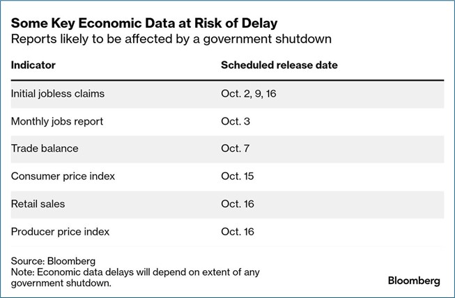 - Angst over a possible shutdown is growing, and the initial reaction is bond bullish. Treasury yields are modestly lower this morning with a deluge of labor market reporting due this week, if the government can manage to stay open and issue said reports. That’s a big if that we discuss in more detail below. Currently, the 10yr Treasury is yielding 4.15%, down 4bps on the day, while the 2yr note yields 3.63%, down 1bp in early trading.