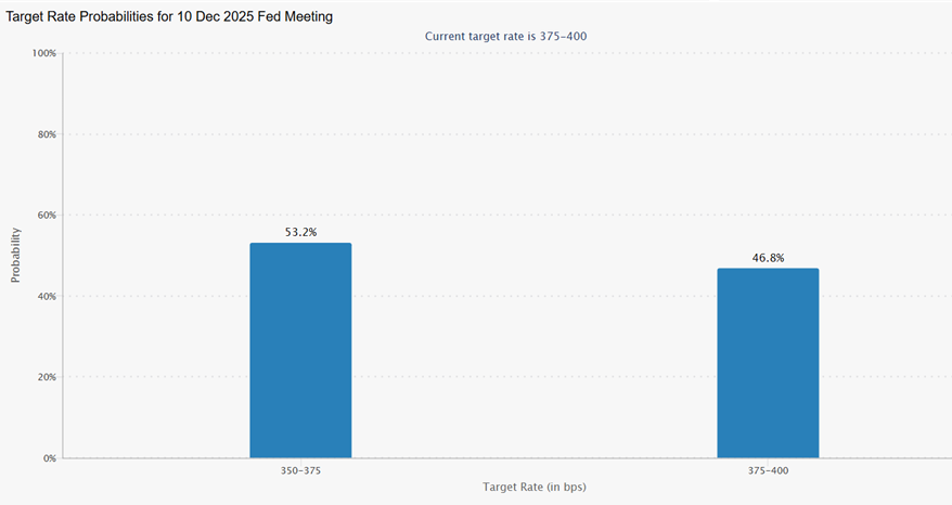 - The FOMC has definitely divided into two camps: those concerned most about inflation and those more concerned about jobs. A comprehensive look at October prices would be critical in developing a consensus to cut or not cut in December. It looks like, however, a robust inflation report for October is unlikely to happen and the November report will not be available until after the December 10th FOMC meeting. The market is getting the sense that in the absence of data, the better part of valor for the Fed is to stand pat and wait until January when the data backlog will have eased. That scenario, however, assumes the September jobs report is not woefully weak, which, if it is, could shift the discussion in favor of a December cut.