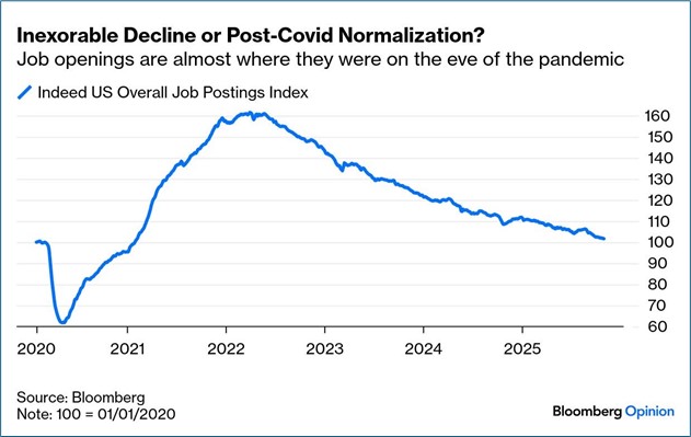 - The Trump administration has commented that an October jobs and inflation report may not come at all, or, if it does, with less than complete data. The issue here is that both reports use surveys and other data collecting methods that once missed are difficult if not impossible to replicate after-the-fact. We have privately issued reports, like ADP, Challenger Job Cuts, and Revelio Labs that posted October estimates of job growth and planned job cuts, and while not all similar, definitely pointed to slowing momentum. Job postings are also back to pre-pandemic levels which either speaks to a return to pre-covid trends, or yet another sign of slowing momentum. Which is it?