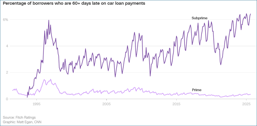- With several Fed officials recently voicing more concern over inflation and less about the economy/jobs, odds for a rate cut in December have plummeted from a 96% probability a month ago to a toss-up at this point (see graph below). That shift contributed to the tech-heavy selling yesterday in stocks, which coincidentally has been the sector fueling the wealth effect for well-to-do consumers flush with stock portfolios near all-time highs. Oh, and futures are pointing to more selling of tech today. Just this week, we are up to four Fed regional presidents with an FOMC vote not pushing the case in recent speeches for a cut next month. Perhaps the lack of data has contributed to a steady-as-she-goes view of the economy? Here’s hoping the eventual release of the missing data doesn’t reveal a different story. Currently, the 10yr Treasury is yielding 4.07%, down 4bps on the day, while the 2yr note yields 3.55%, down 5bps in early trading.