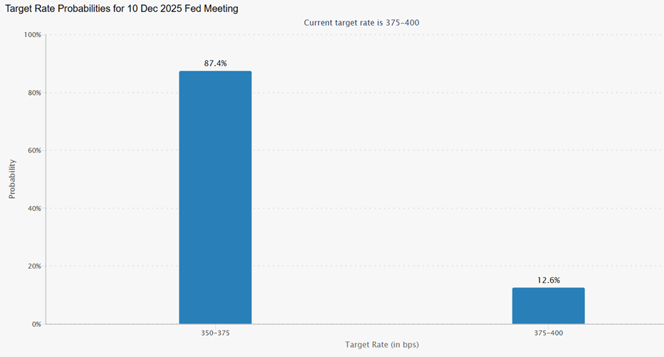 - Finally, Friday will provide the last of the inflation and spending numbers for September with the Personal Income and Spending Report. Expectations are that core PCE will be up 0.2% MoM with the YoY rate unchanged at 2.9%. With the stale nature of the data, along with high odds of a December rate cut (see graph below), it will take a big miss to the upside to derail a cut at this late date. And that is unlikely as the PCE has been easier to predict with the other inflation numbers already released which helps analysts fill in the PCE picture.